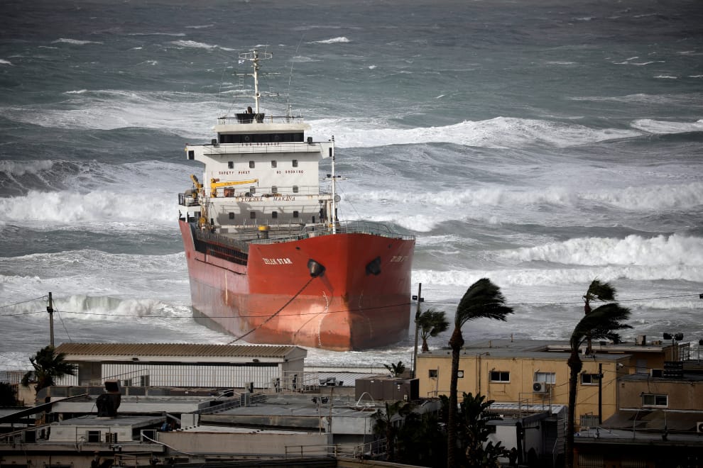 在港口城市阿什杜德(Ashdod),強勁的海風把這艘 14公尺高、90公尺長的貨船直接打到岸上,所幸沒有人員受傷。