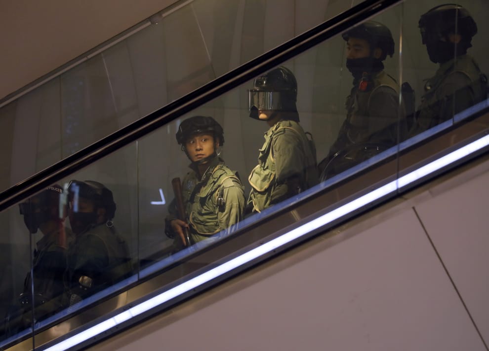 鎮暴警察穿梭在商場之間,想阻止反政府示威者前來這裡示威。