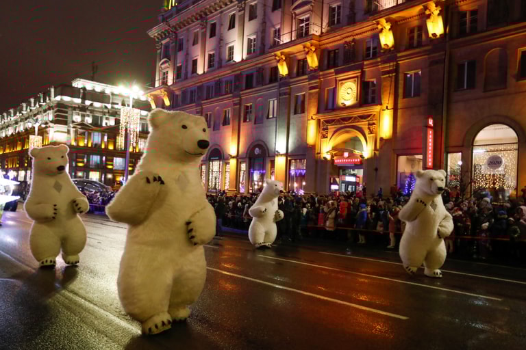 在首都明斯克(Minsk)的聖誕遊行上,「北極熊們」也在隊伍中參與了這歡樂的一刻。