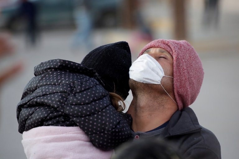在一座移民營裡,一名男子抱著女兒誠心祈禱著。這裡因為爆發水痘疫情而被衛生人員暫時封閉。