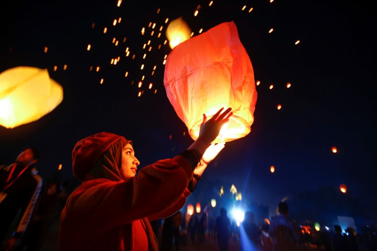 在納傑夫市(Najaf)的一場學生活動上,大學生們讓手上的天燈升上空中,在黑夜間顯得格外醒目。