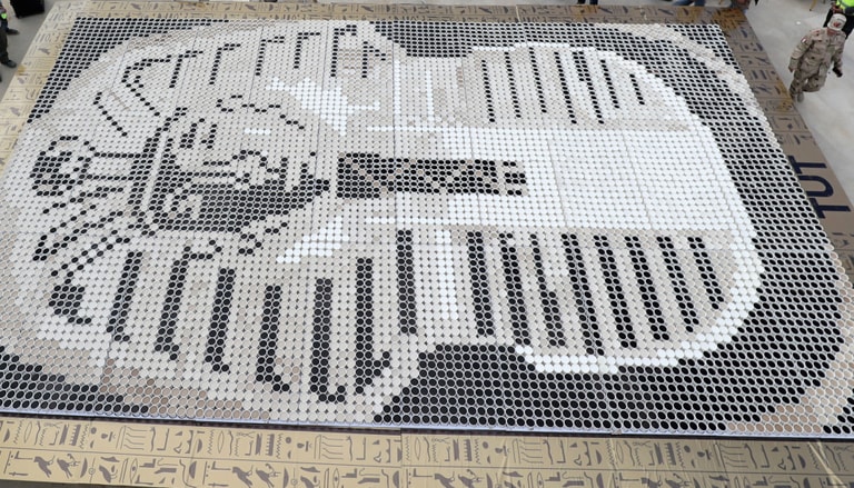 在大埃及博物館外,人們用咖啡杯排出了古埃及法老圖坦卡門(Tutankhamun)的死亡面具。