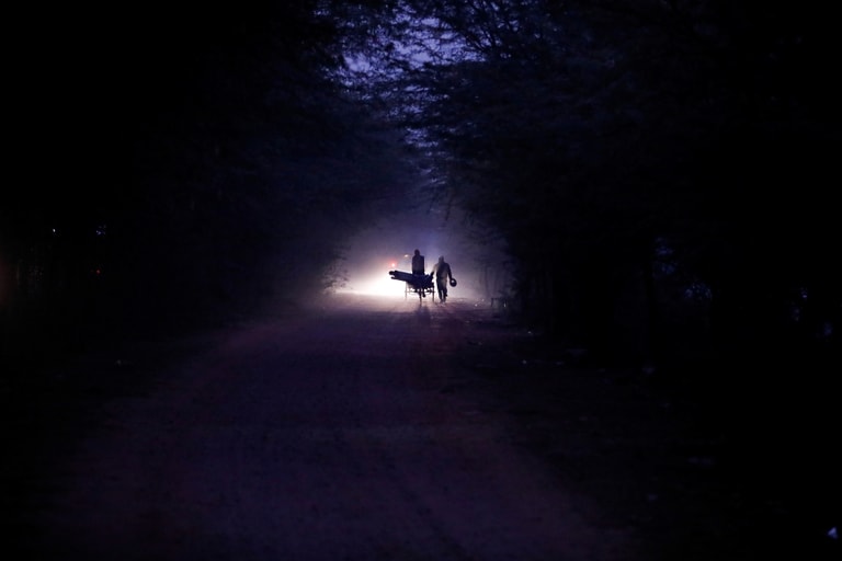 在一個寒冷的傍晚,一名男子藉著微弱的燈光在路上行走著。