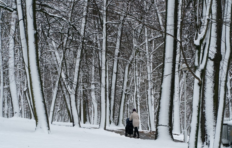 一名女子推著娃娃車,穿梭在一座被白雪覆蓋的公園裡。
