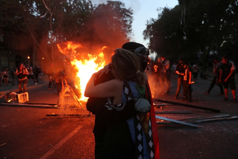 在首都聖地牙哥(Santiago)的示威街頭,示威者在火光前相擁安慰著彼此。