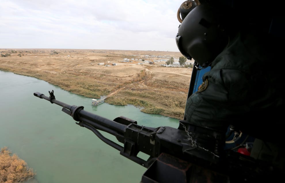 在一座直昇機上,伊拉克武力部隊的成員保持最高警戒,尋找是否有伊斯蘭國(IS)的殘存勢力。
