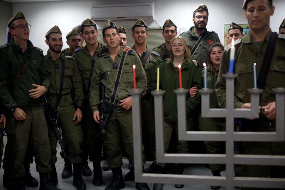 以色列士兵齊聚一堂,一一替眼前的燭台點起蠟燭,標誌著「光明節」(Hanukkah)的到來。