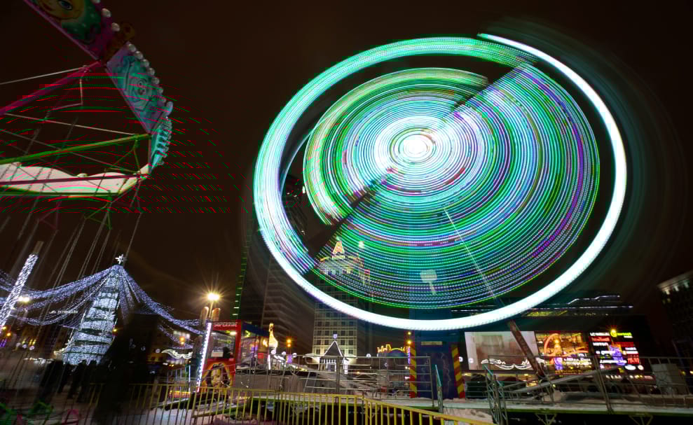 人們在遊樂園裡玩得不亦樂乎,享受著周末傍晚的片刻歡欣。