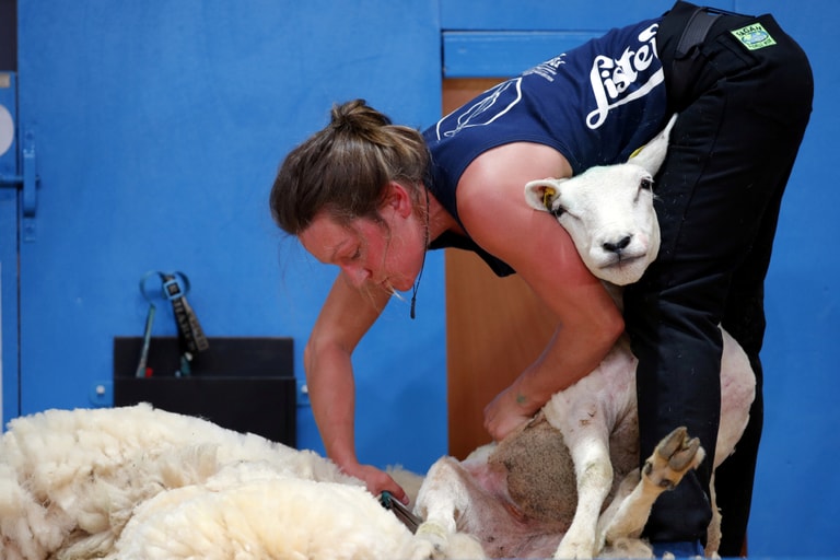 在世界綿羊剪毛錦標賽上,一名參賽者夾住綿羊、手腳俐落地把牠身上的毛給剃個精光。
