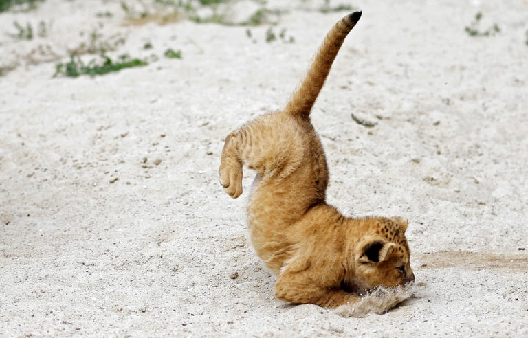剛出生不久的小巴巴里獅(Barbary lion)在動物園裡左蹦右跳,探索著這個未知的世界。