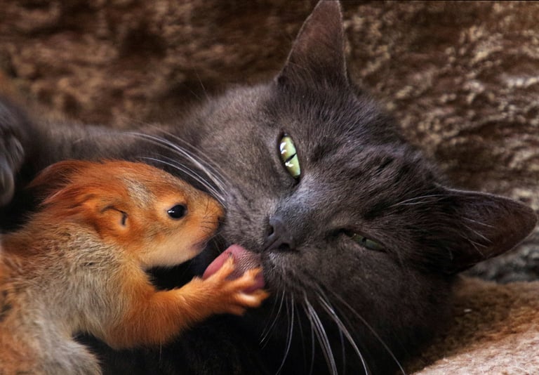 一切起於普莎的飼主在發現 4隻松鼠孤兒後,便把牠們帶回家飼養。一開始,普莎對這 4隻小生物有些遲疑,但隨著時間經過,普莎已經很習慣讓牠們在自己身上蹭來蹭去,還會主動幫牠們梳毛。