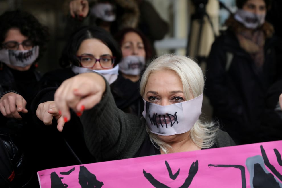 在城市法馬古斯塔(Famagusta)的法庭外,示威者舉起標語,聲援疑似被輪暴卻反被判誣告的英國少女。