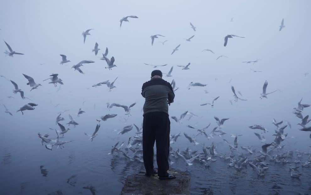 在一個薄霧繚繞的早晨,一名男子正在餵食海鷗們。