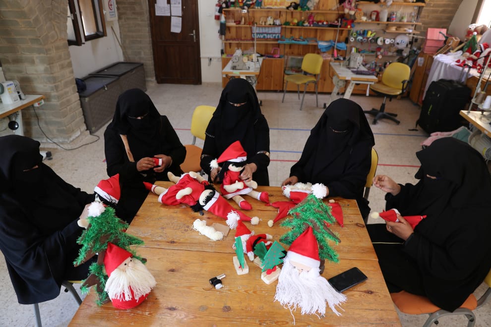 在加薩走廊某處,一些巴勒斯坦女子正專心製作手上的聖誕老人娃娃。
