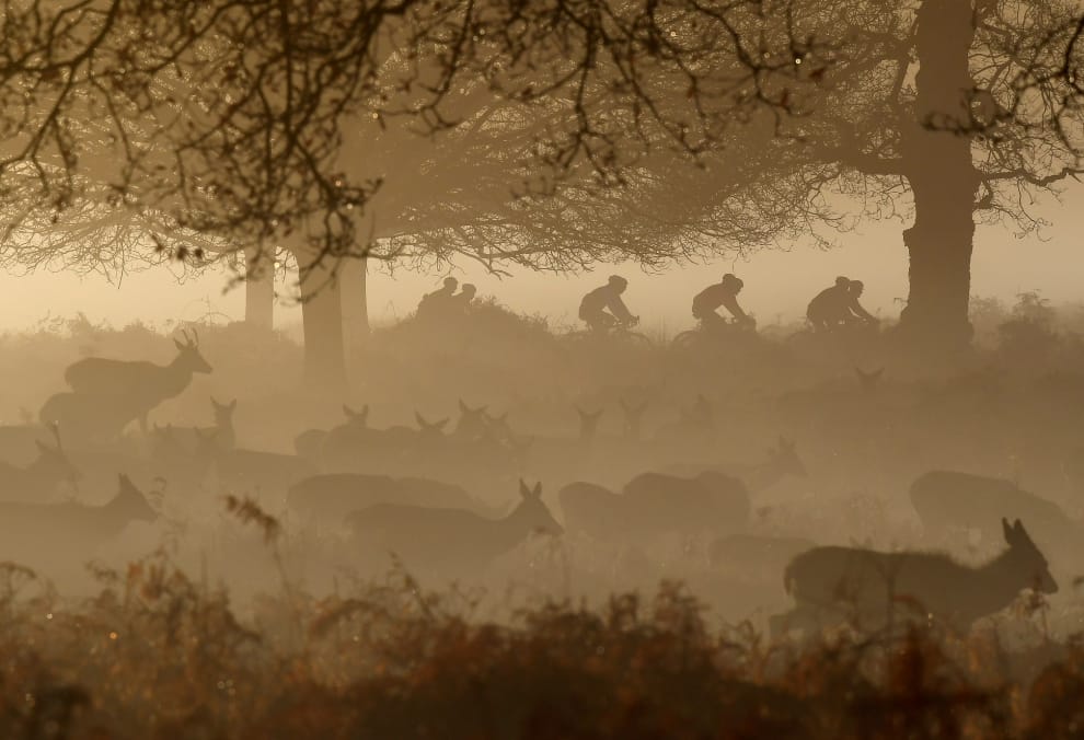 在里士滿公園(Richmond Park),一群騎著自行車的人經過了正在大嚼早餐的鹿群。