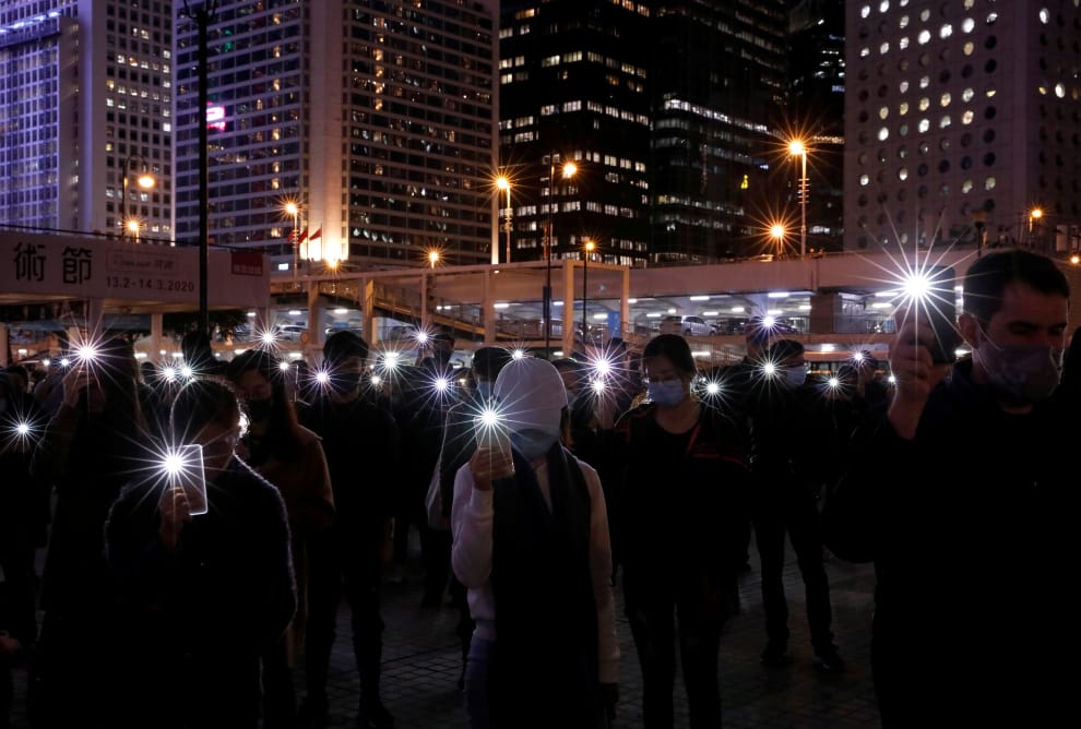 反政府示威者在愛丁堡廣場上舉起手機,用燈光舉出想要改變現狀的希望。