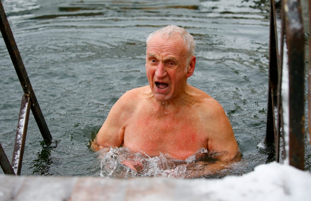 在一個節慶活動上,一名男子浸到冰水裡頭,希望能藉此讓自己身強體健。