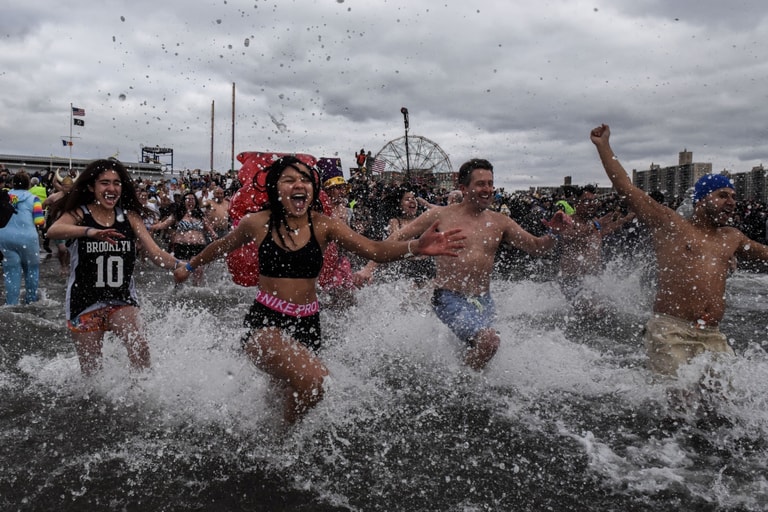 在紐約康尼島上,參加「年度北極熊浸冷水活動」的人們一舉衝入大西洋中,又冷又開心的模樣顯得好不愉快。