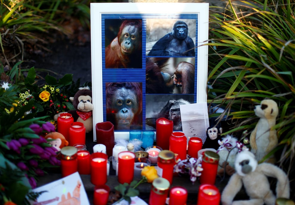 克雷菲爾德動物園(Krefeld Zoo)猿猴館外擺滿了蠟燭與花朵,向逝去的 30多隻動物們致意。