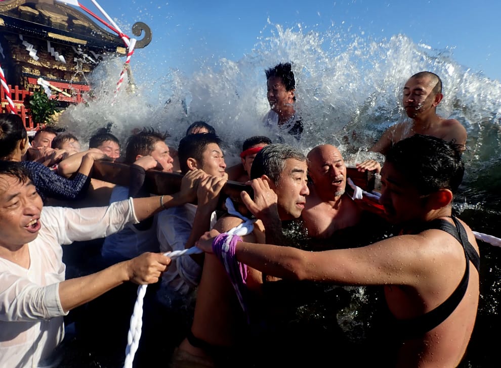 在神奈川縣大磯町,人們一同把神轎扛入水中,祈求 2020這一年風平浪靜與萬事順利。
