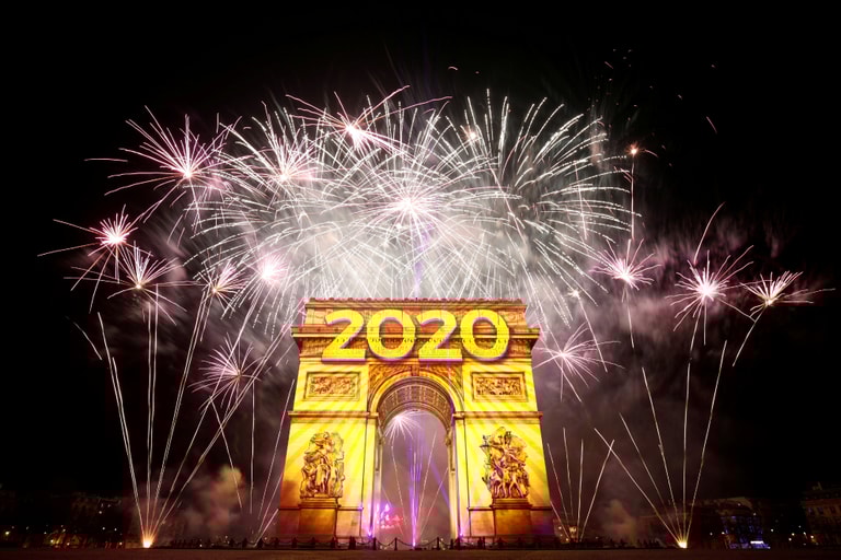2020年1月1日,法國巴黎香榭麗舍大道的新年慶祝活動期間,煙火照亮了凱旋門上空。