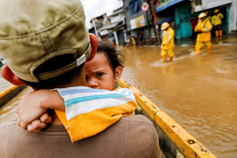 在遭逢水患的雅加達,一名小女孩緊緊抱著爸爸的脖子。