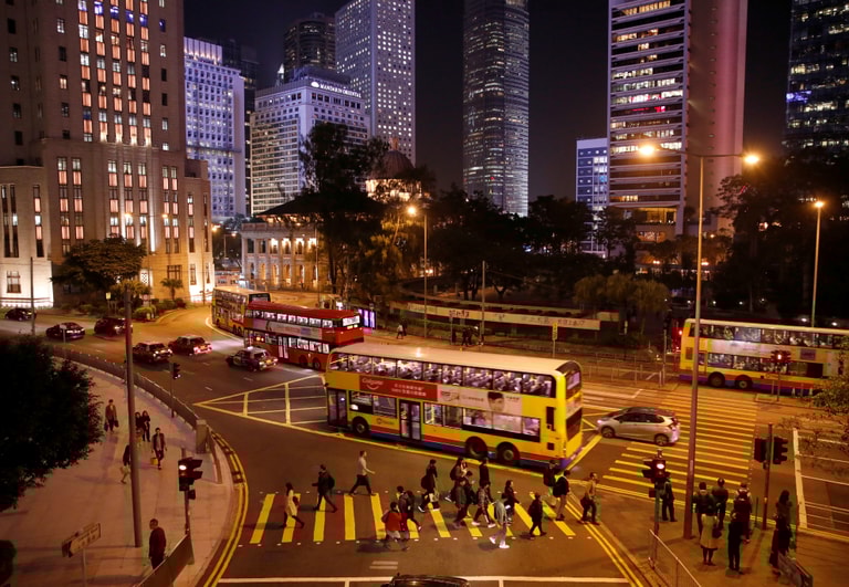 在人來人往的中環區,行人和雙層巴士交織成了街景。