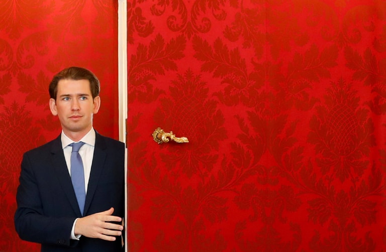 奧地利前總理、現任人民黨黨魁庫爾茨(Sebastian Kurz)在與奧地利總統范德貝倫(Alexander Van der Bellen)開完會後離開總統辦公室。