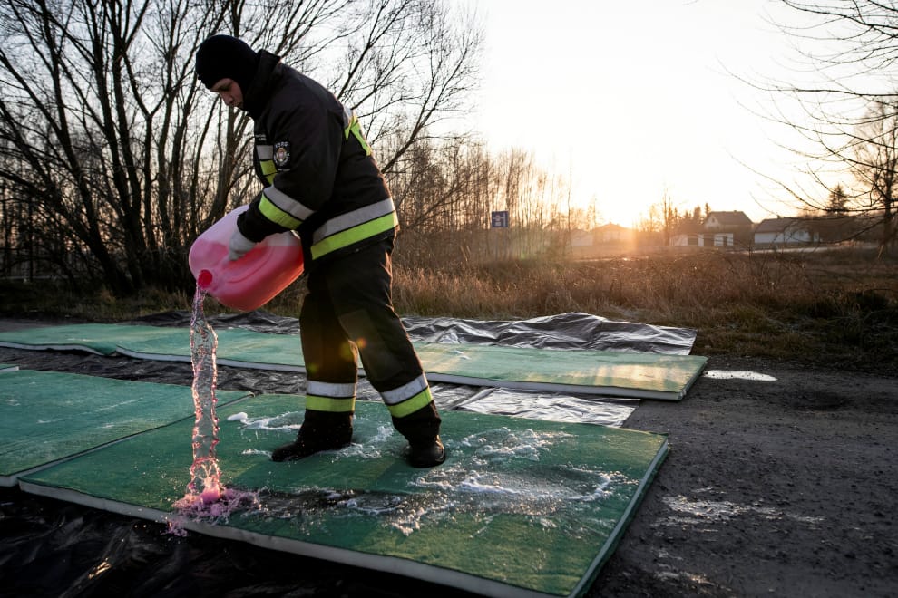 一名消防人員在傳出禽流感議題的地方灑上消毒藥水,杜絕疫情擴散的可能性。