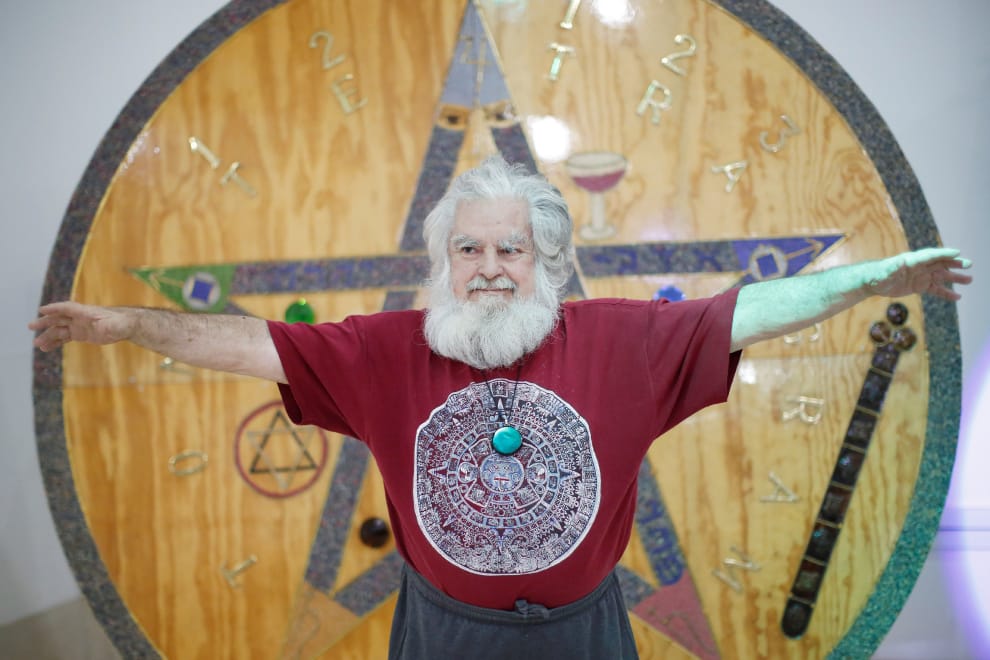 自稱為「大術士」的西班牙男子艾巴(Antonio Vazquez Alba)擺出姿勢接受拍照,他準備要用塔羅牌預測 2020年的運勢會怎麼走。