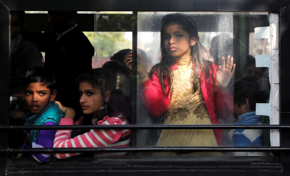 在新德里(New Delhi),人們隔著巴士窗戶,看著畫面另一端正在進行反對《公民身份修正法案》的示威。
