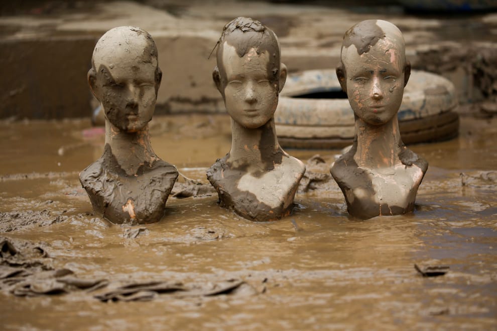 在水患退去後,三座人形模特兒的頭部被置在了地上。這幾天,印尼西爪哇省一帶出現連夜大雨引發的水災,造成至少 43人死亡。
