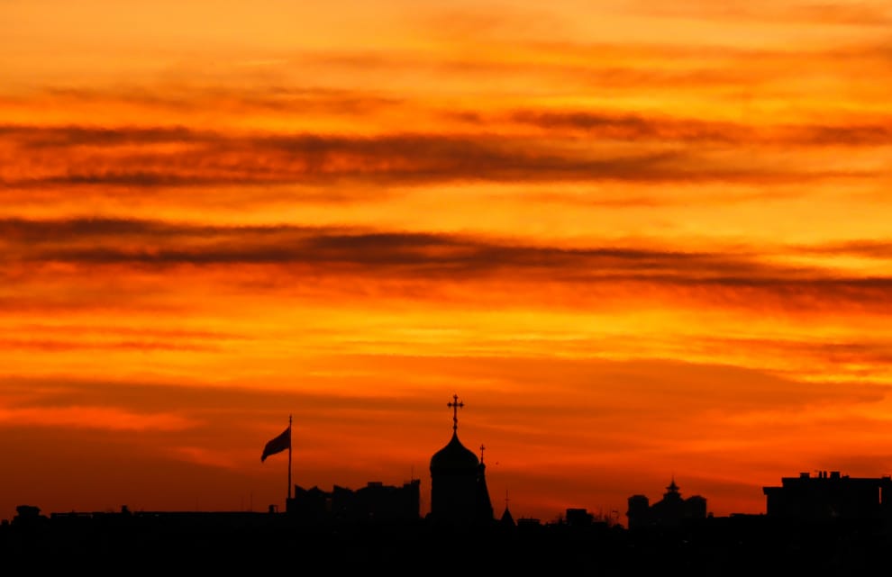 在首都明斯克(Minsk),升起的太陽替天空妝點上橘澄澄的色彩。