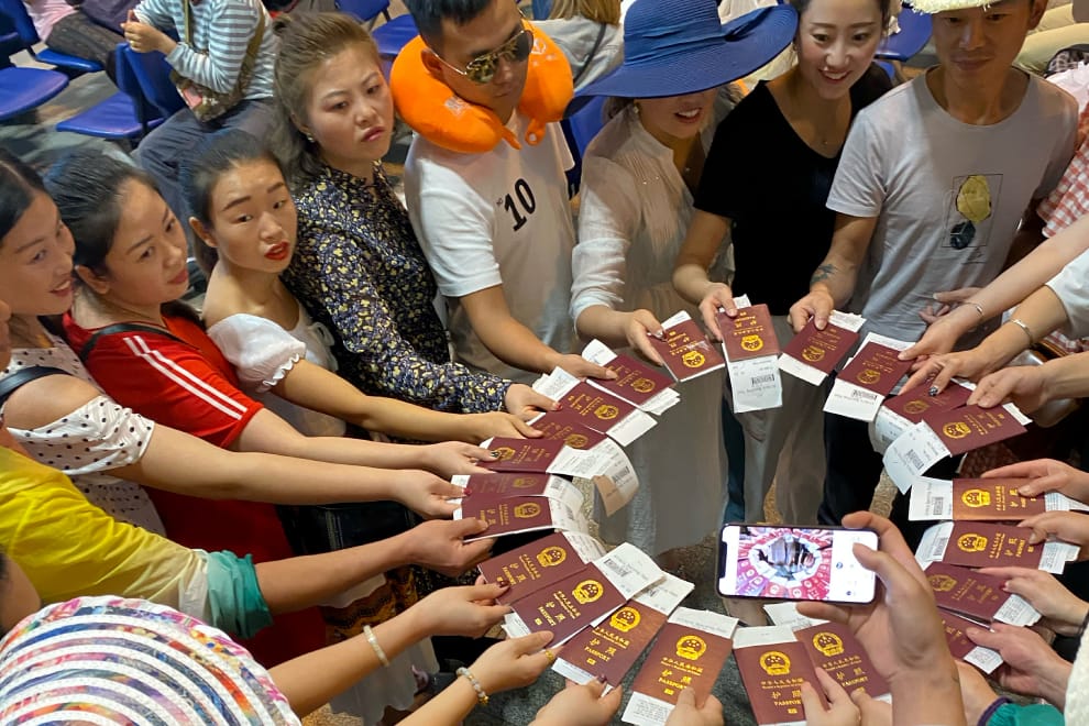 在廊曼國際機場,來自中國的團客一「圈」排開手上的護照和機票,乍看之下顯得好不壯觀。