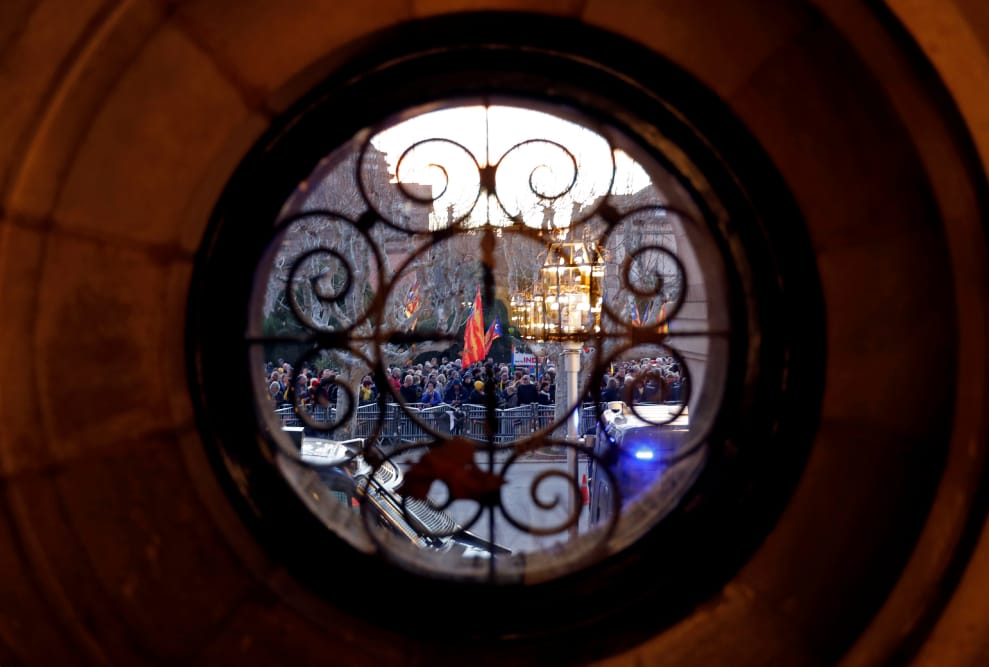在加泰隆尼亞議會裡,可以看到支持加泰隆尼亞獨立的人們走上街頭,聲援被西班牙選舉委員會取消資格的加泰隆尼亞主席托拉(Quim Torra)。