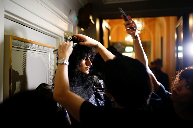 在倫敦時裝周上,造型師忙著幫模特兒做好造型,要呈現出她最完美的模樣。