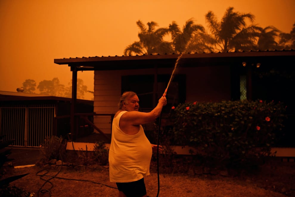 在一片「橘濛濛」的天色下,居民們忙著用水幫屋子降溫,希望大火不會波及到這裡。