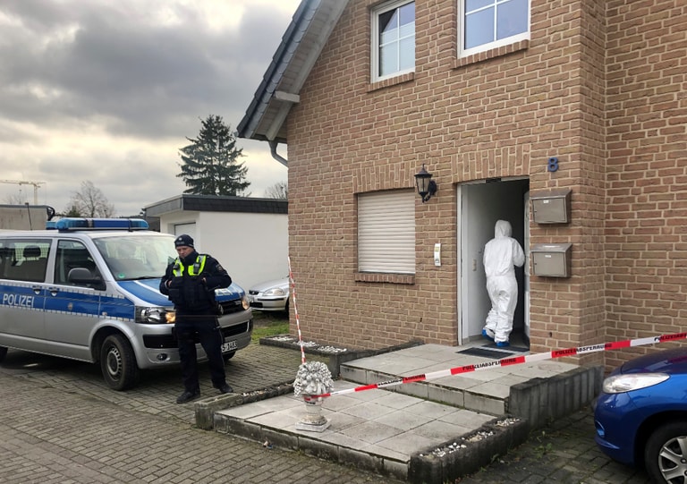 在德國西部市鎮朗格韋厄(Langerwehe),一名警察守著事發現場,鑑識人員則忙著蒐集任何的蛛絲馬跡。根據當地媒體報導,他們在這裡找到了 3具屍體。