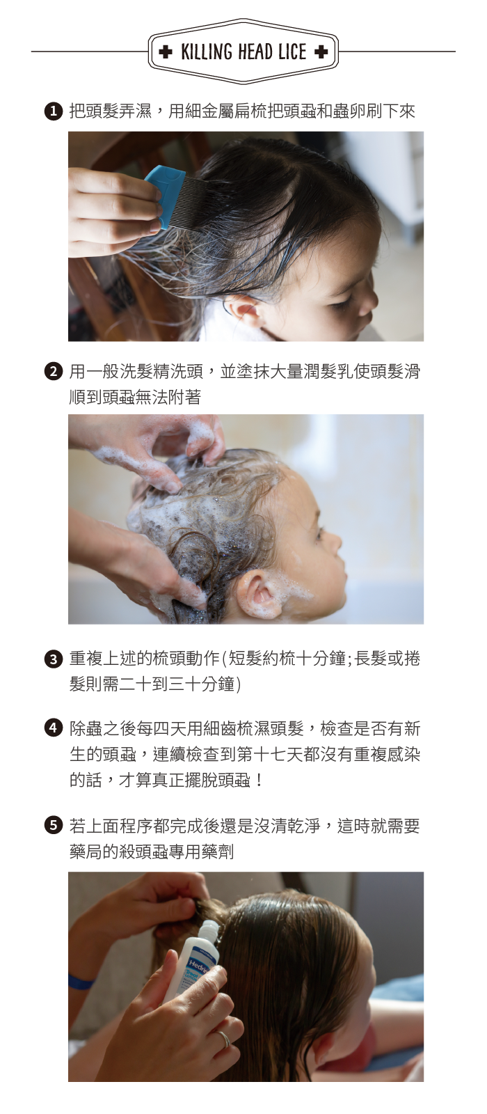 根據英國健保局(NHS - National Health Service)的官方資料,頭蝨是常見於孩童及家人間的傳染病,並經由頭與頭接觸傳染,和頭髮髒不髒亂沒有太大的關係。最簡單的檢查頭蝨方式是用細齒金屬扁梳仔細梳頭,並翻找是否有成蟲或蟲卵隱藏其中,一旦確定罹患頭蝨就必須立即確認家人有無感染,並實行「除蝨五部曲」: