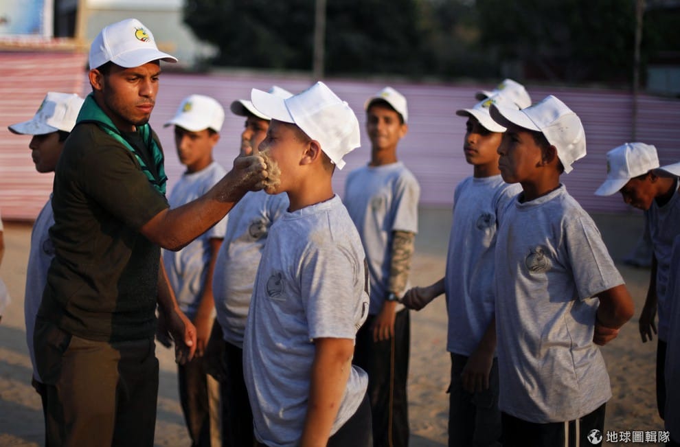 照片中是加薩當地的一個青年營,教官把沙土塞到學員口中。