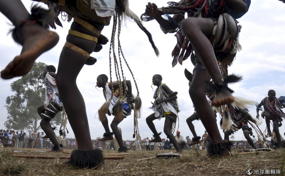 照片中是烏干達當地的青年,他們正在舉辦成年禮。年輕人們邊唱歌邊跳起傳統舞蹈。