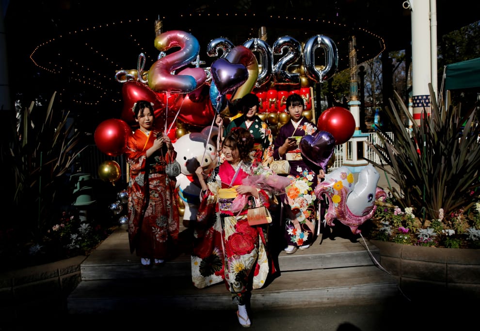 畫面中穿著和服的女性來到東京豐島園兒童樂園,準備參加他們的成人慶祝儀式。