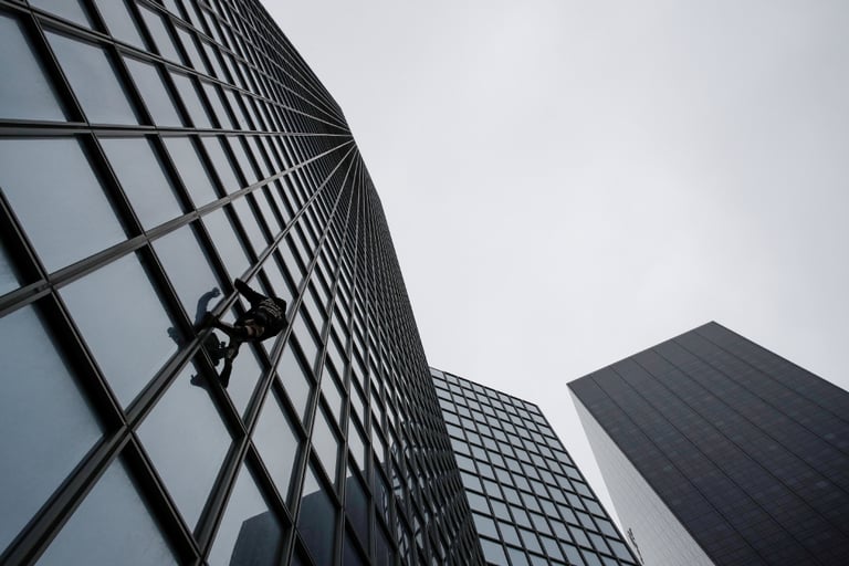有「法國蜘蛛人」之稱的羅伯特(Alain Robert)爬上了巴黎的道達爾塔(Tour Total),對現在如火如荼地反退休制度改革罷工表達支持。