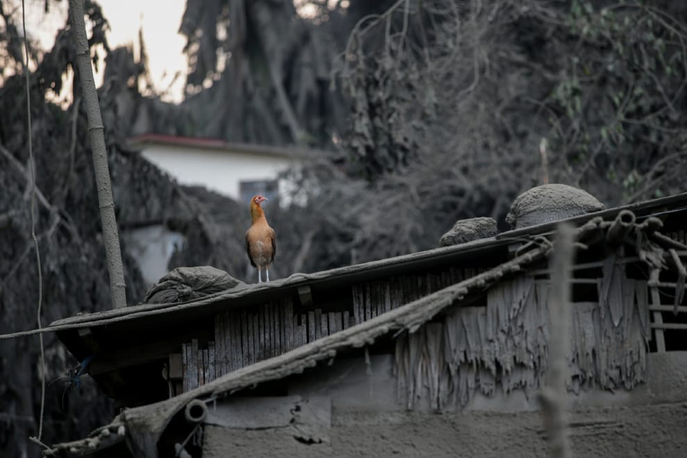 在塔爾火山(Taal volcano)噴出大量火山灰後,停留在農舍的雞幾乎成為畫面中唯一的色彩。