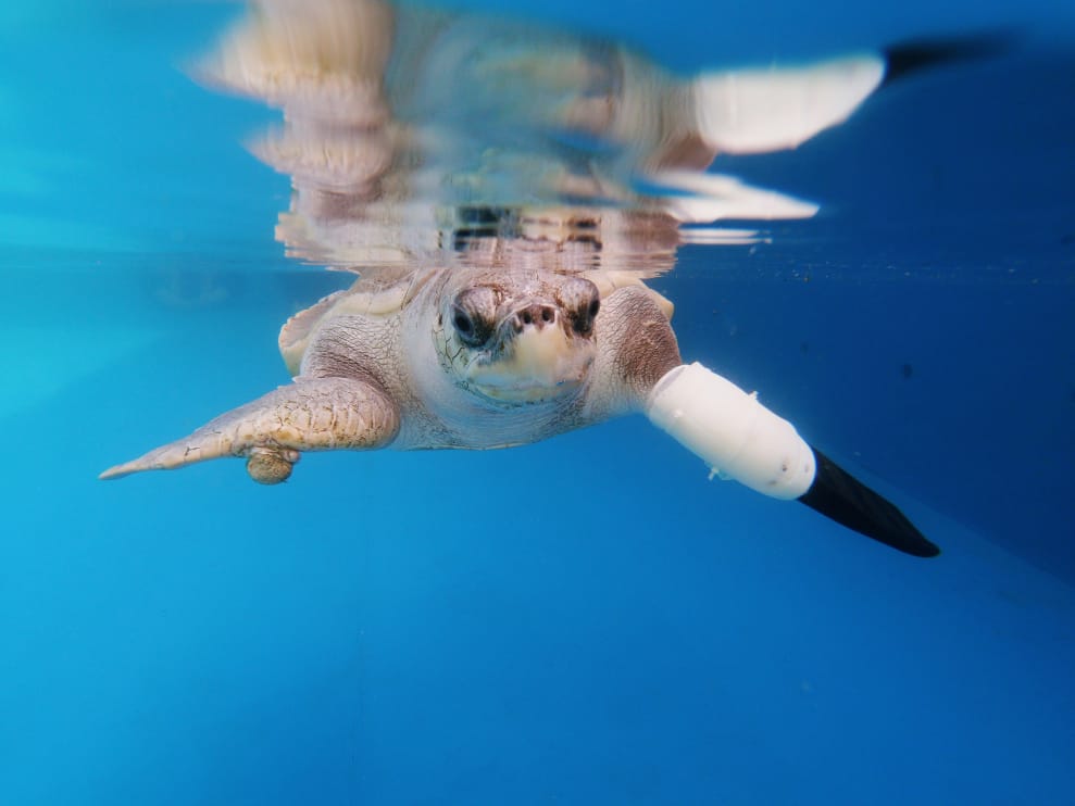 海龜姑蒂(Goody)被裝上了義肢,在水面下進行了首次試游。牠的「手」因為捲入漁船受了傷。