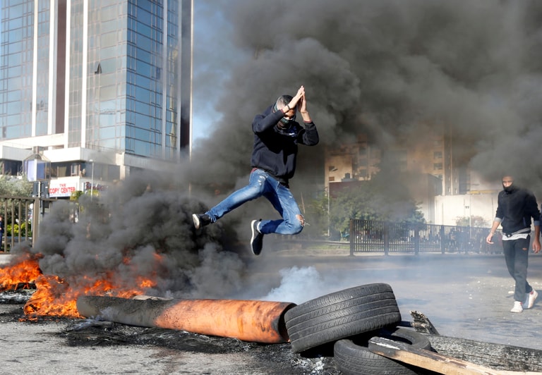 一名示威者跳過了燃燒的輪胎,他們走上街頭是為了抗議遲遲不見好轉的經濟與新政府難產的現況。