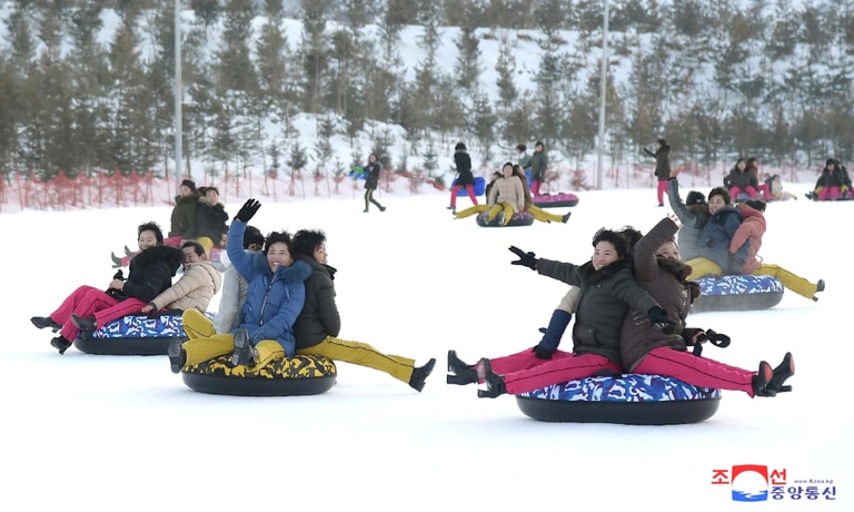 在陽德溫泉度假村裡,《朝鮮中央通訊社》(KCNA)紀錄下了在開心滑雪的北韓人民。