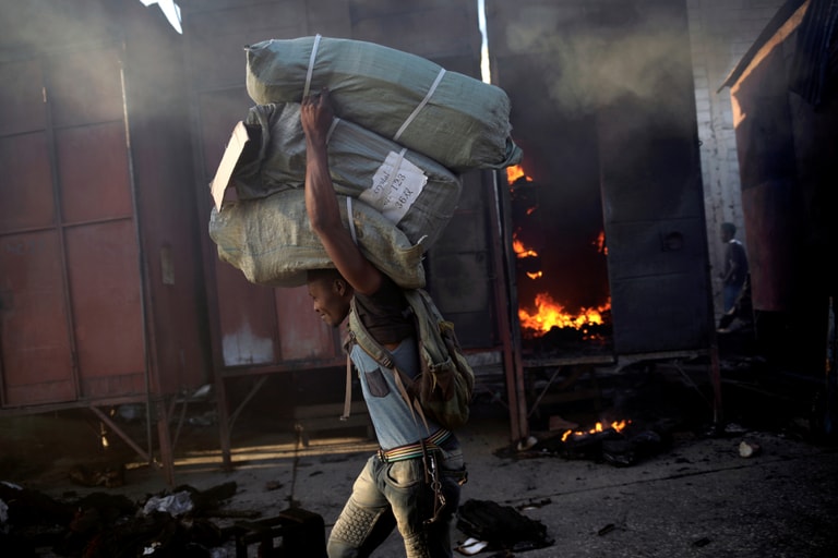 在一座被大火付之一炬的市場裡,一名男子趕忙把能帶走的商品搬走,希望能把損害降到最低。