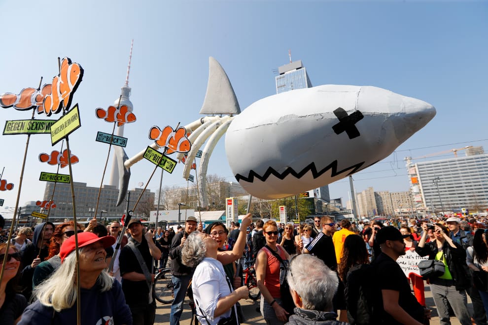 2019年4月6日,人們在柏林街頭抗議房租高漲、房源稀少,以及「房市鯊魚」虎視眈眈綁架柏林租屋市場。