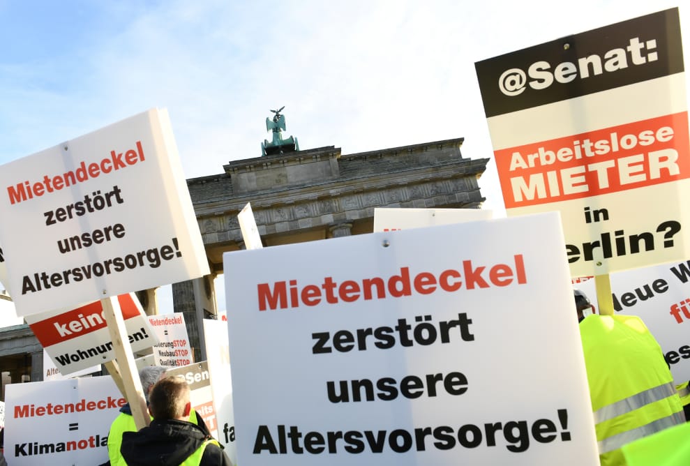 2019年12月9日,在柏林著名地標勃蘭登堡城門前,營建業工人齊聚一堂抗議柏林市政府打算推行的房租凍漲政策。他們手上拿著寫有「最高租金的限制毀了我們的養老金」字樣的牌子。